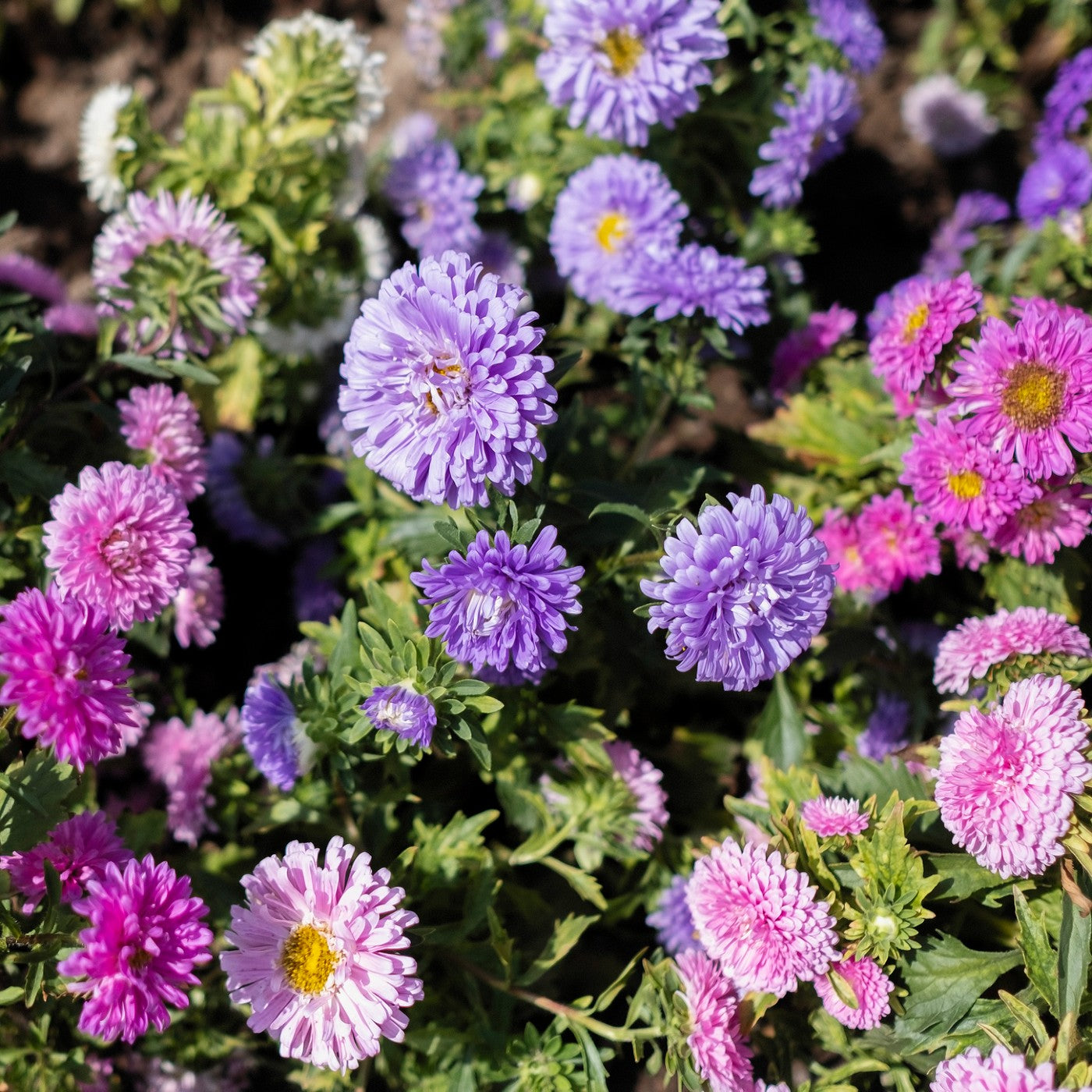 Aster Powderpuff Mix - Callistephus chinensis - Fragrant, deer resistant addition to your garden in a lovely array of colors from light blue to pink, red, apricot and near white. Asters are easy to grow and very popular due to their mum-like blooms in such rich colors. A gorgeous addition to the garden.