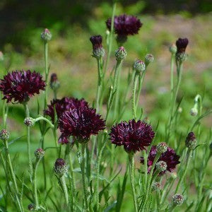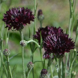 Black Ball Cornflower or Bachelor Button Black Ball - Centaurea cyanus - This cornflower has very dark purple almost black blooms with tall silver stems. Nice contrast amongst other flower or cornflowers. Adapts to a variety of soils, heat and drought tolerant, deer resistant. Great for any area, cut flowers, border, pollinators and the flower petals are edible.