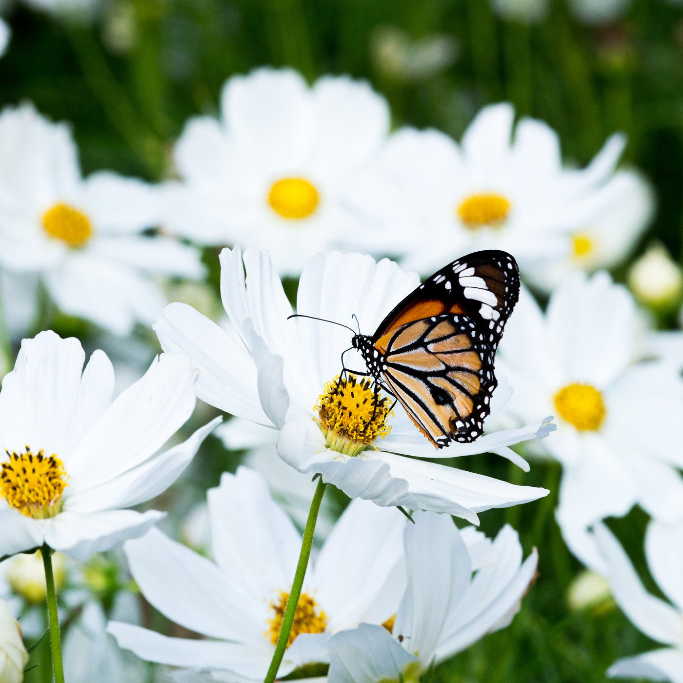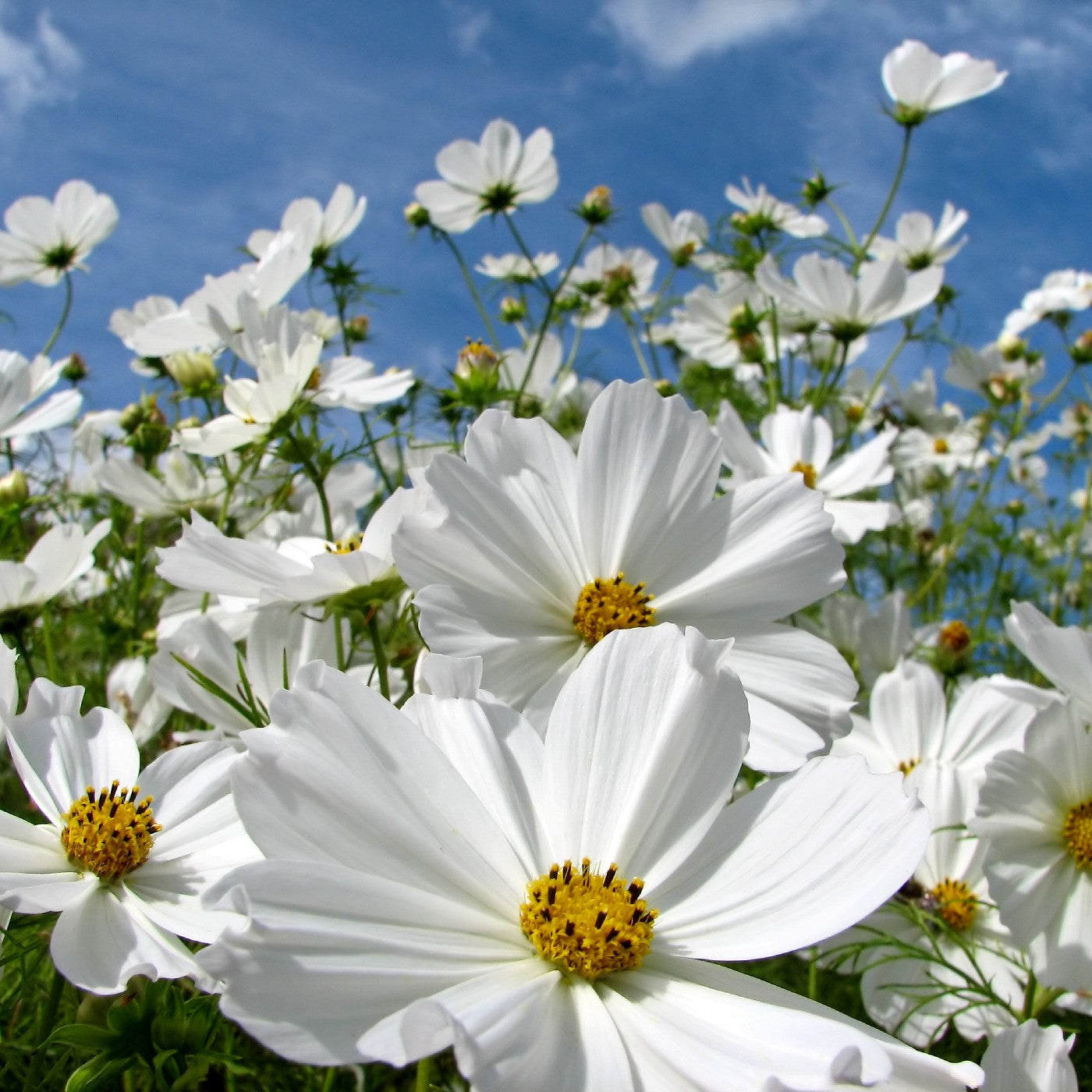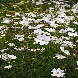 White Purity Cosmos - Cosmos bipinnatus - These Cosmos are sure to create a glow in your garden with their pure white color. As with all Cosmos, easy to grow and hardy.