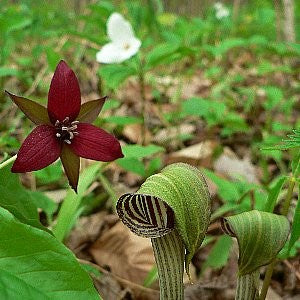 JACK-IN-THE-PULPIT - Arisaema triphyllum (Seeds per Packet: 10+) Jack-in-the-pulpit is a shy plant found in rich, moist woodland or shade areas. A perennial favorite blooming early to late spring. Forms a cluster of bright, shiny red berries. Up to 25 in. tall. WOODLAND Blooms in Spring.