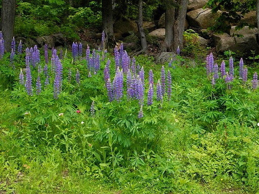 Perennial Lupine - Lupinus perennis - This native flower boasts an elongated flower head stacked with blue to purple blossoms. Wild Perennial Lupine is a big favorite. Great plants with palm-shaped leaves and beautiful blooms providing a big spring show. Great cutting flower and birds, bees and butterflies love them.
