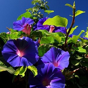 Morning Glory - Ipomoea purpurea - Because of their fast growth, twining habit, attractive flowers, and tolerance for poor, dry soils, some morning glories are excellent vines for creating summer shade on building walls when trellised. Beautiful blue to purple flowers they make a stunning climber. Hummingbirds, butterflies and bees seem to adore them. They close up towards the end of the day to invite new blooms the next!