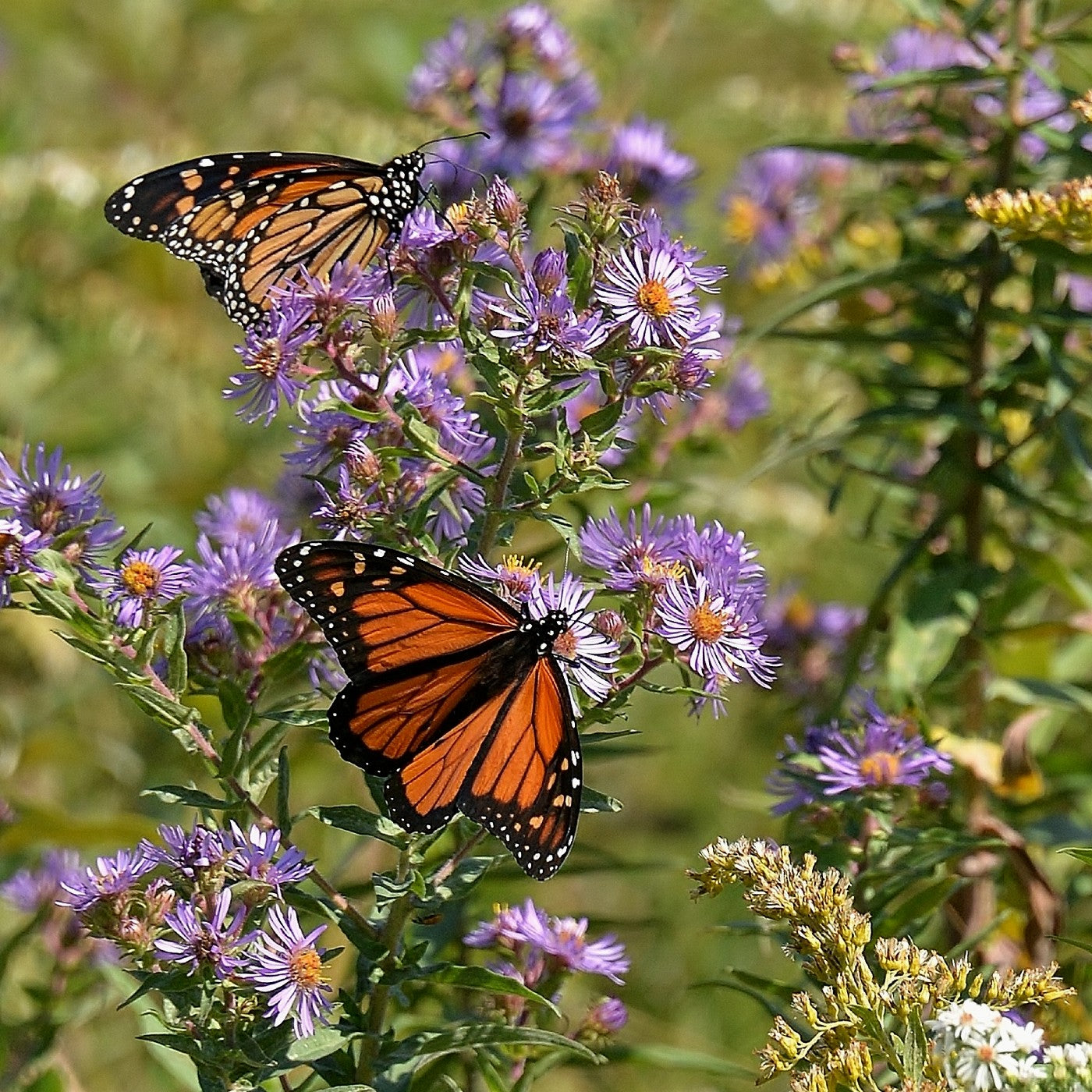 NEW ENGLAND ASTER - Aster novae-angliae - 3-5 feet tall; a very big autumn favorite! Bright purple with a distinct yellow center, these are the jewels of fall bloom. One of the only true late season bloomers. New England Aster can be used for roadside plantings, prairie restoration, wildlife cover, all types of meadow landscaping as well as in individual gardens and wetland situations. Great planted with another true late season bloomer, the perennial sunflower.