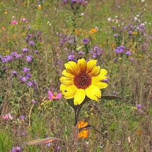 Sowing: Once your soil is prepared and free of previous growth, it’s important to sow immediately. (If you let time go by between preparation and spreading your seed, you’re giving possible weeds an advantage over your wildflower seed). You can use a hand crank seed spreader, but most simply scatter the seed by hand. If you want to be sure to get good, even coverage, divide your seed into two roughly equal parts, in two buckets or cans. Then add clean sandbox sand to both halves, roughly 4-5 parts of sand to 1 part of seed. The sand does two things: It “dilutes” the seed, making it easier to sow evenly, and since it’s light-colored, it shows you “where you’ve been” on the dark soil as you go. Next, sow one bucket’s mix over your whole area. Then go back in the opposite direction and do the same with the second bucket. This way, you should have even spreading and no bare spots. Once seed is sown, do not rake or cover it in any way. If you can, use a lawn roller or lay down a large board and walk on it to compress (squash down) the seed into the bare soil. Remember, some of the seed you’re sowing is tiny; even the lightest covering of soil can stop it from germinating. Keep your new seedbed moist until seedlings are about 6-8” tall. After that, they should be self- sufficient; however watering during droughts will keep your flowers blooming.