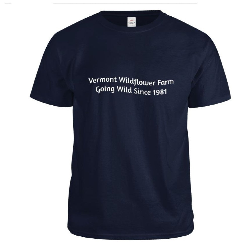 Vermont Wildflower Farm Men’s Custom T-shirt. A classic 100% cotton t-shirt featuring a tear-away label to free you from that scratchy tag. Constructed with pre-shrunk cotton material and cut to a standard fit. Color: Navy Available in Medium, Large and Extra-Large