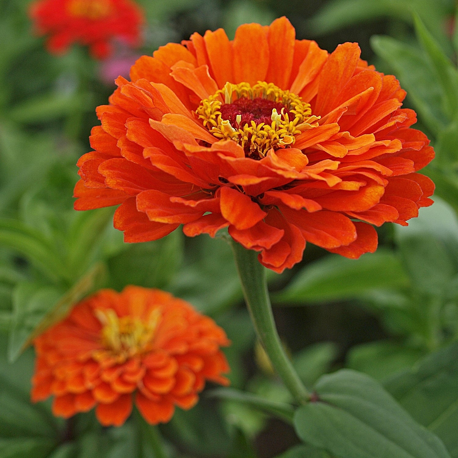 Zinnia Orange - Zinnia elegans - Zinnias have small to large vibrant blooms depending on your area. One of the easy to grow annual flowers, blooming from mid-summer all the way until frost providing beautiful color. These all-orange zinnias are a showy, vibrant addition. Who doesn't love orange zinnias as they make a great cut flower in summer?